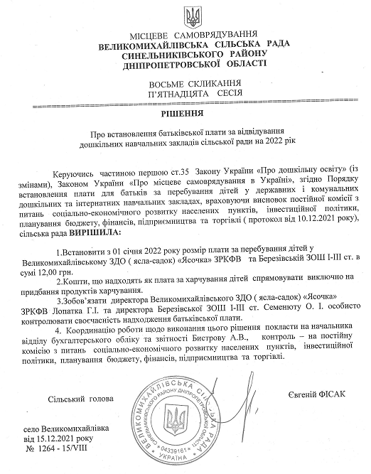Про встановлення батьківської плати за відвідування дошкільних навчальних закладів сільської ради на 2022 рік
