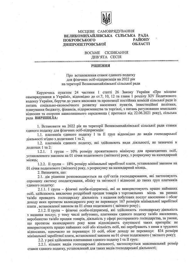 Про встановлення ставок єдиного податку для фізичних осіб-підприємців на 2022 рік на території Великомихайлівської сільської ради