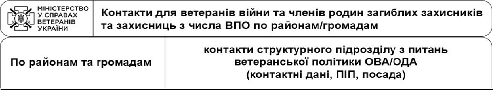 073 796 58 57, 056 796 58 57 Оберняк Інна, адміністратор відділу з організації надання адміністративних послуг; 063 335 99 53 Трикула Олена, начальник відділення ветеранської політики |
